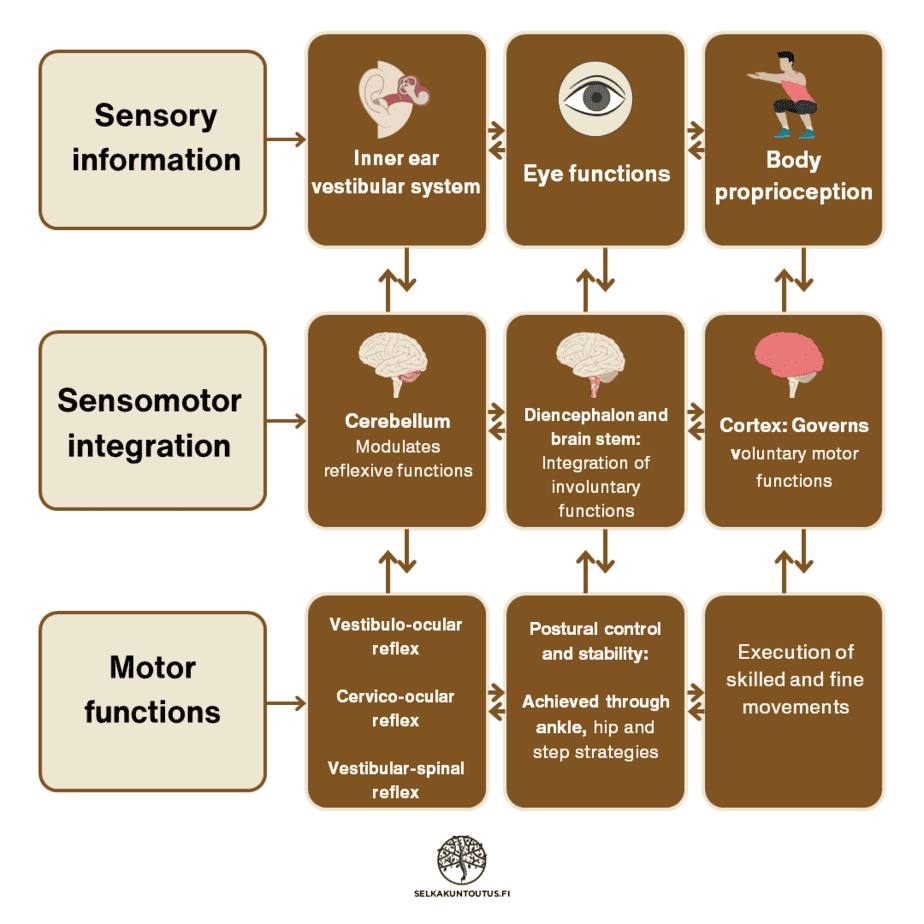 - The brain combines sensory inputs from inner ear, vision, and body to maintain stability.